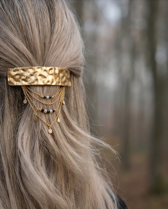 Une barrette délicate aux chainettes dansantes. Elle transforme une coiffure simple en détail précieux.