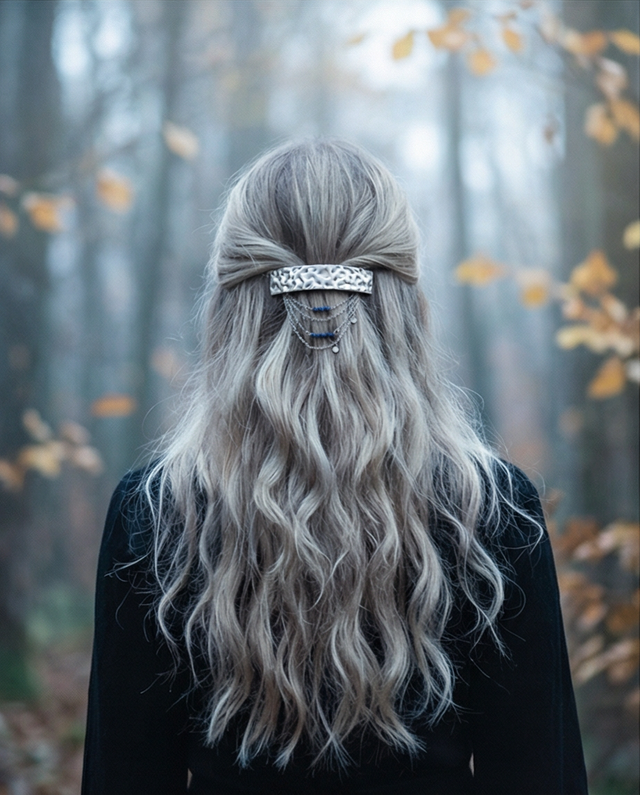 Une barrette délicate aux chainettes dansantes. Elle transforme une coiffure simple en détail précieux.